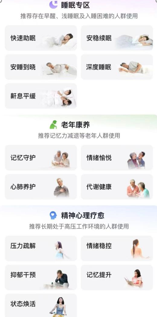 - 聚焦入睡困难、浅睡眠、早醒、睡眠打鼾人群,打造快速助眠、深度睡眠、鼾息平缓等睡眠方案;